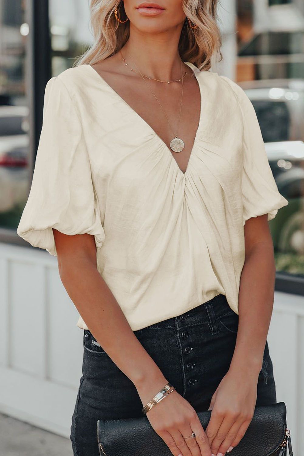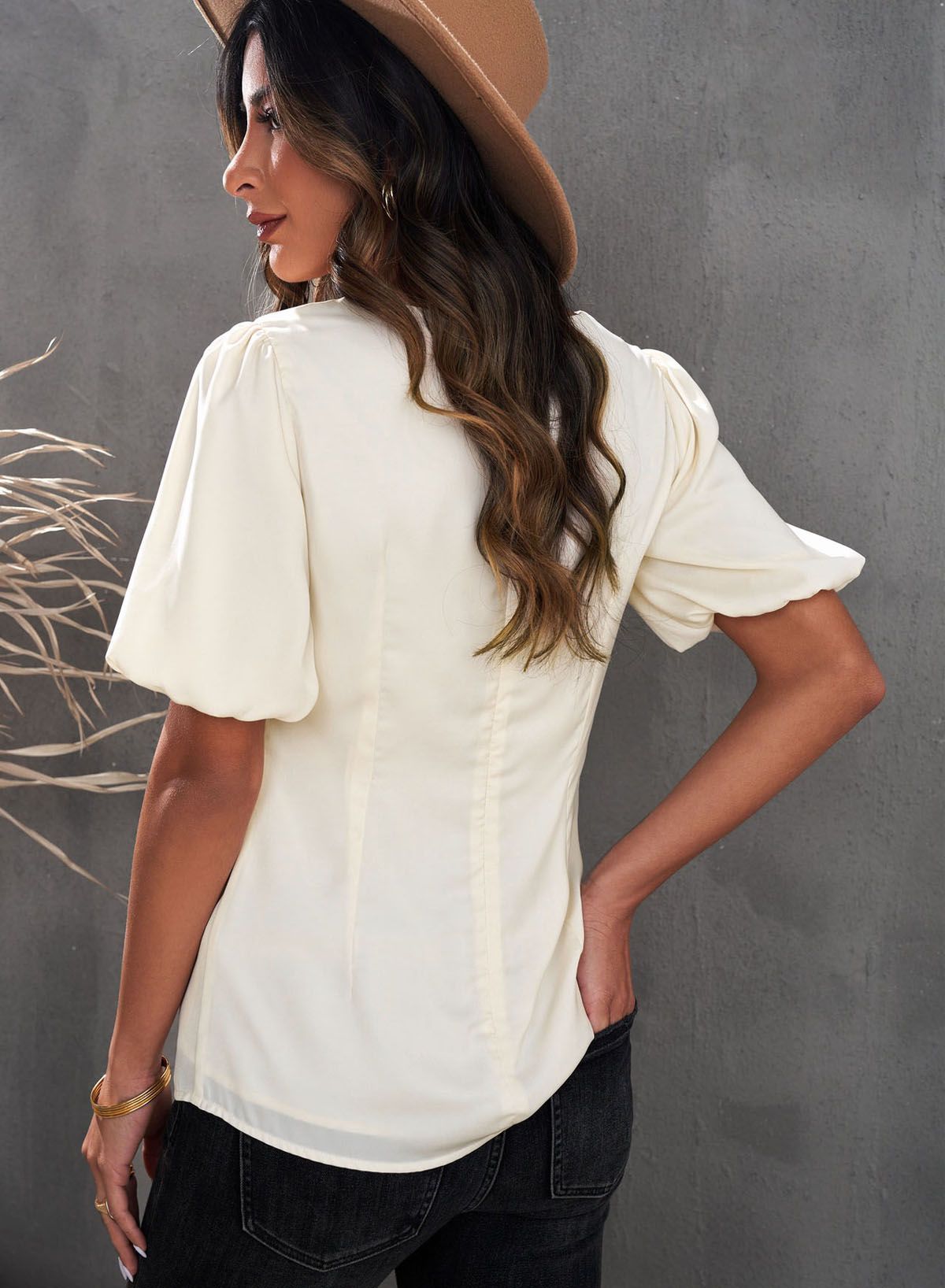 Solid blouse with puff sleeve is chic and elegant