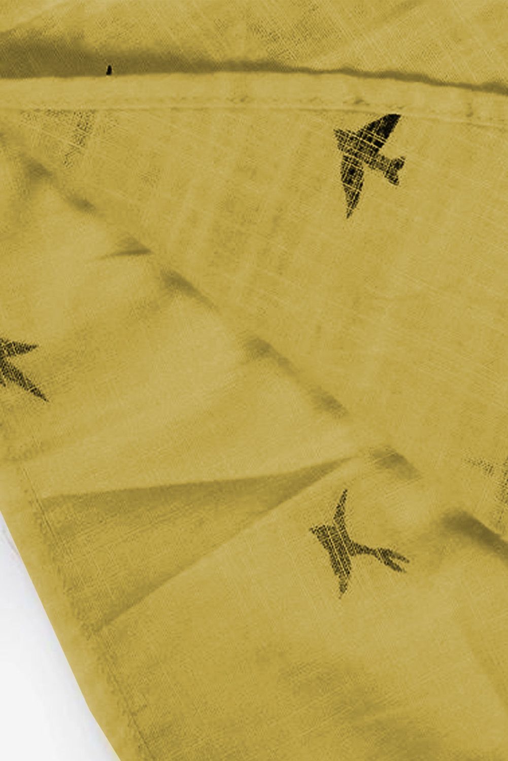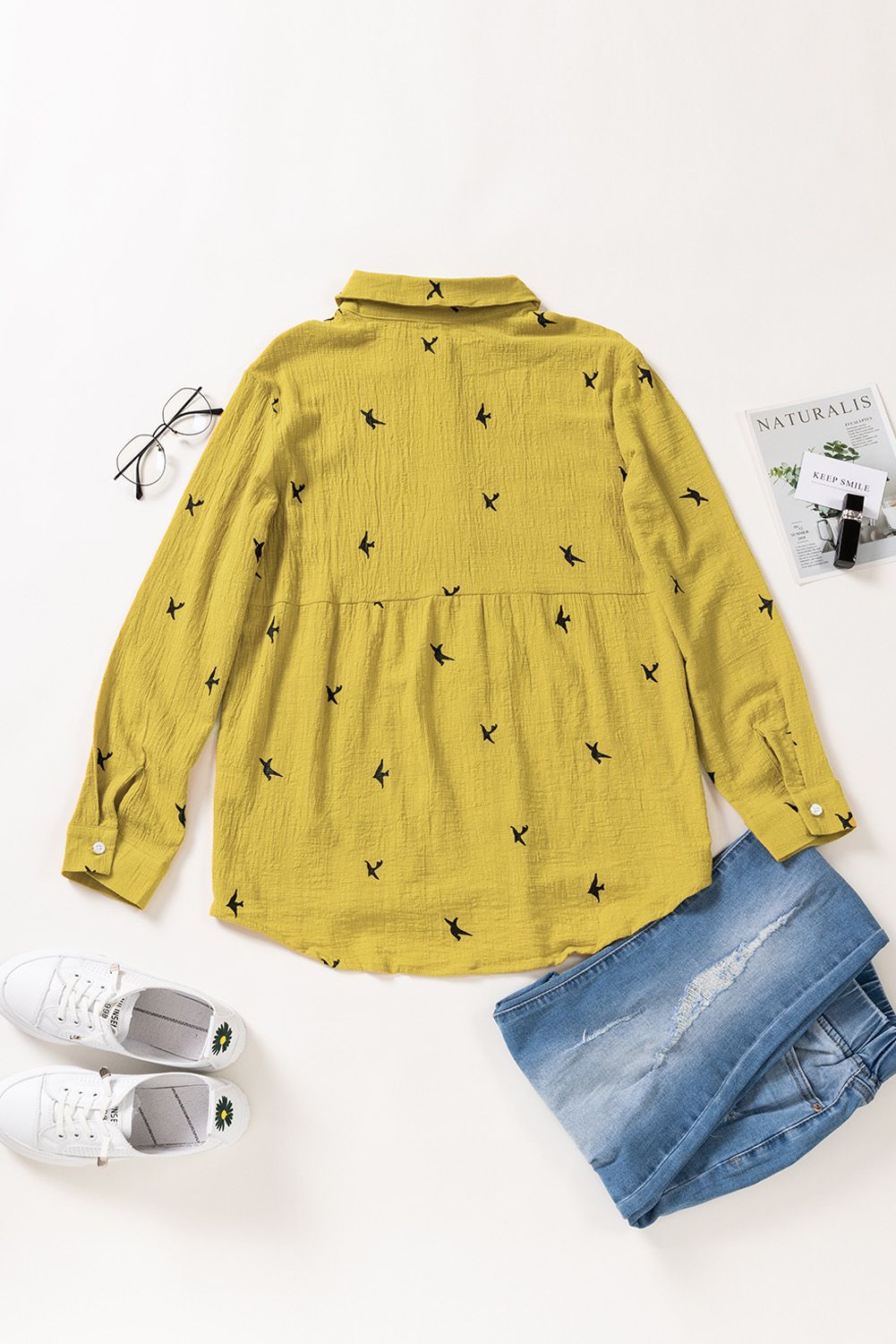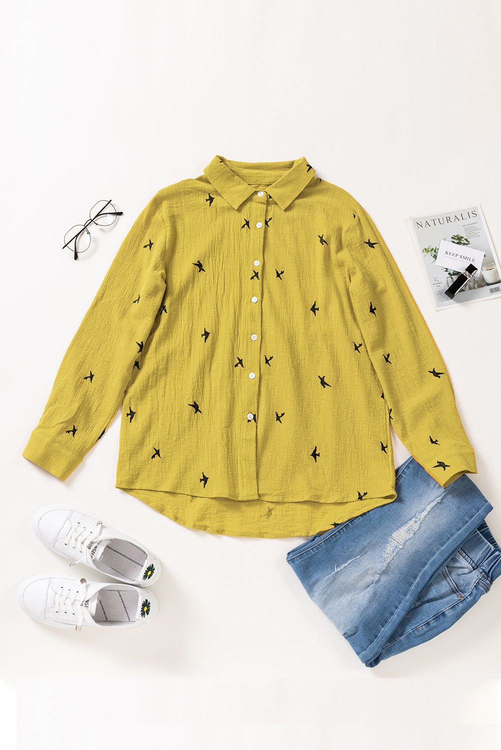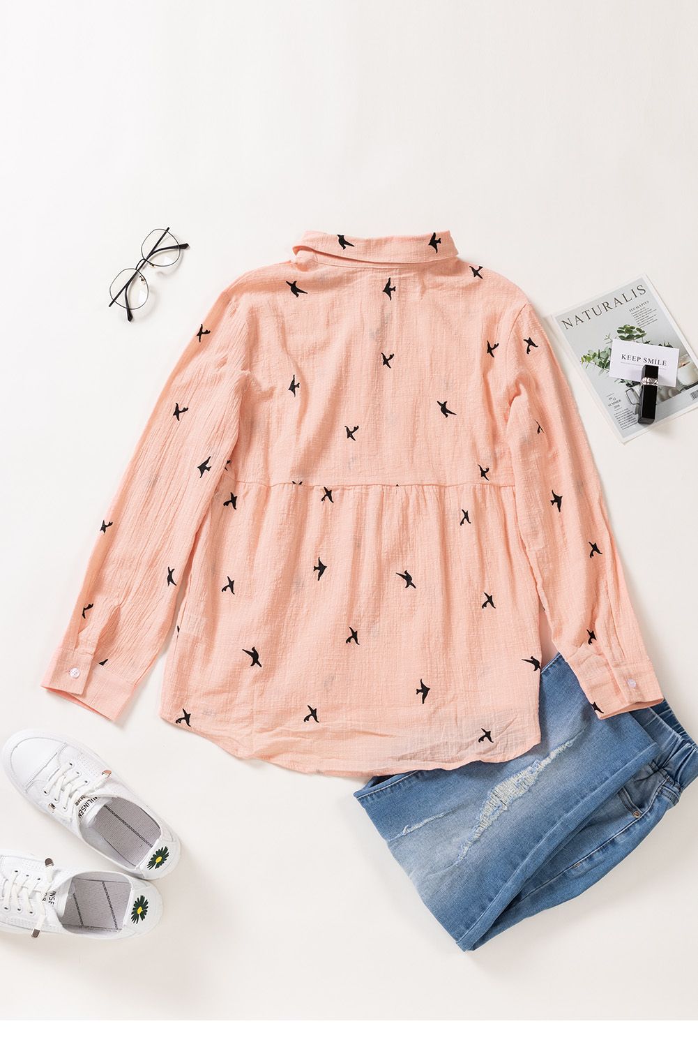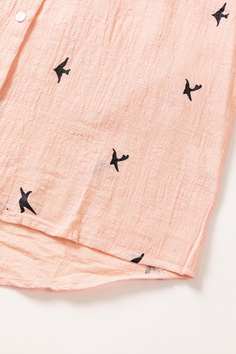 Solid color shirt with bird print throughout, button closure front