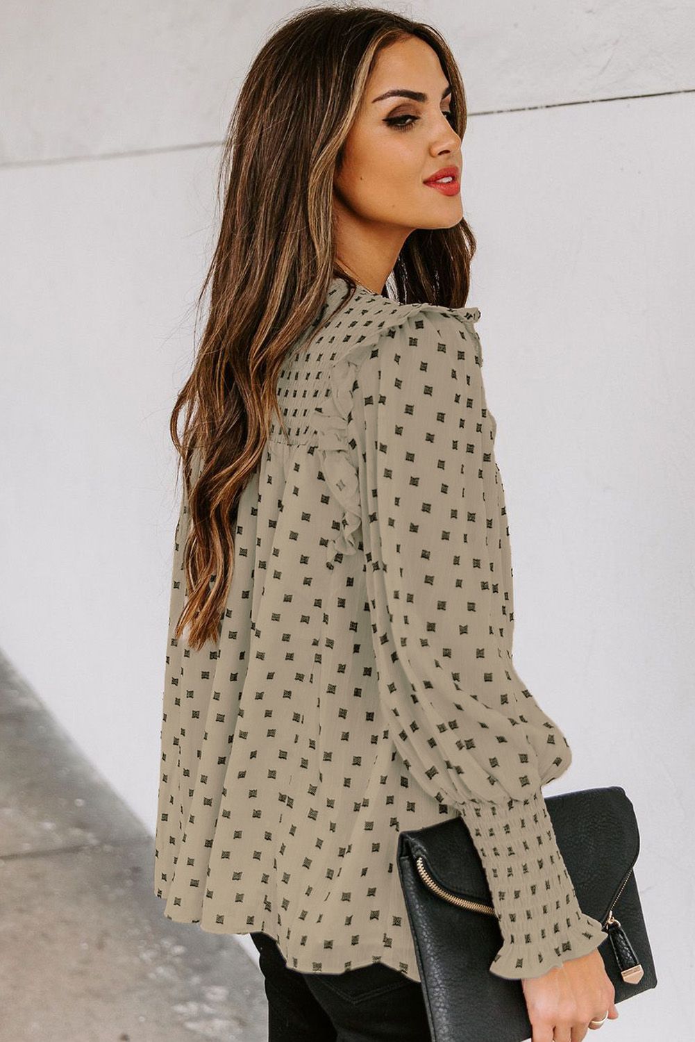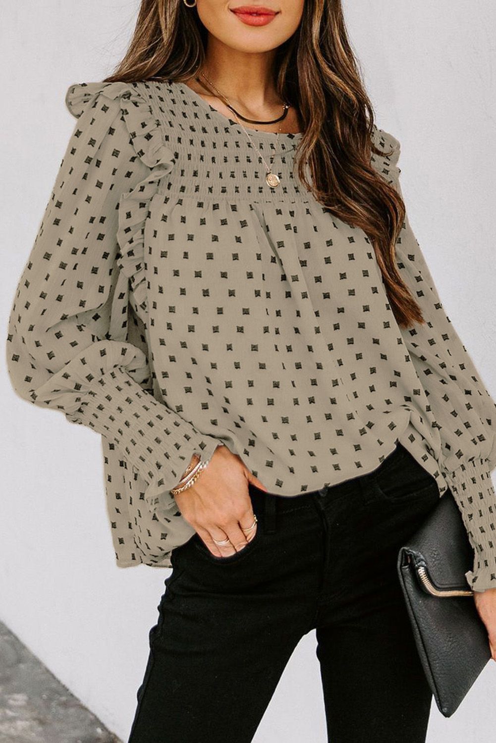 Apricot Smocked Ruffle Trim Blouse