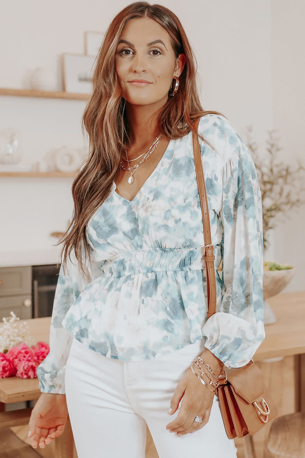 • This printed peplum top features a v-neckline, long dropped sleeves, and has a gathered waistline