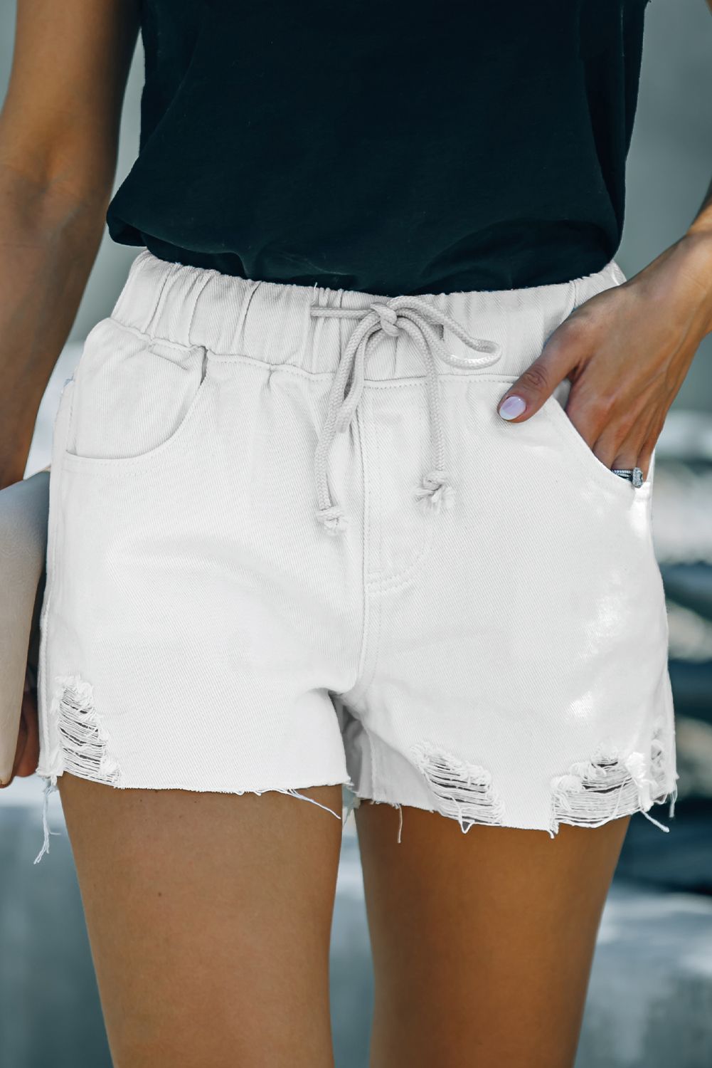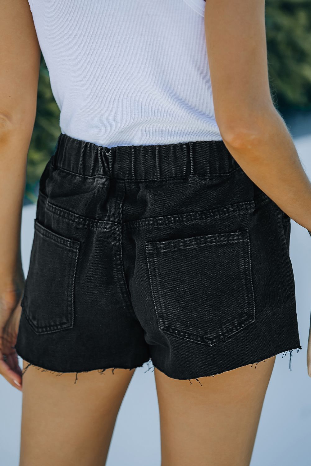 Black Elastic Waist Drawstring Distressed Denim Shorts