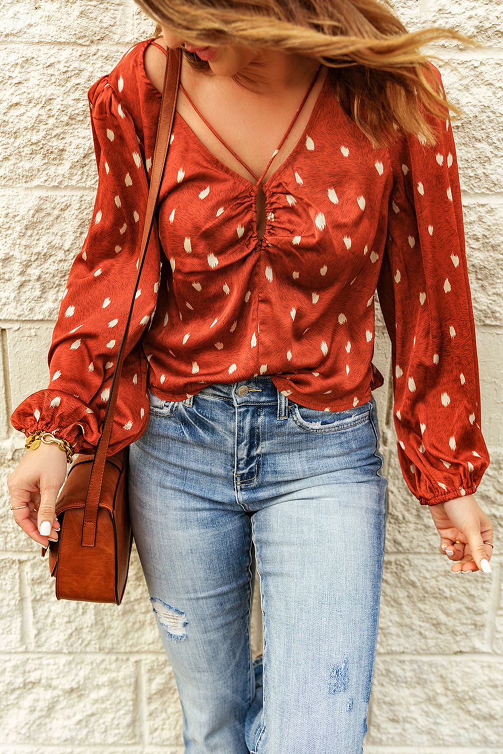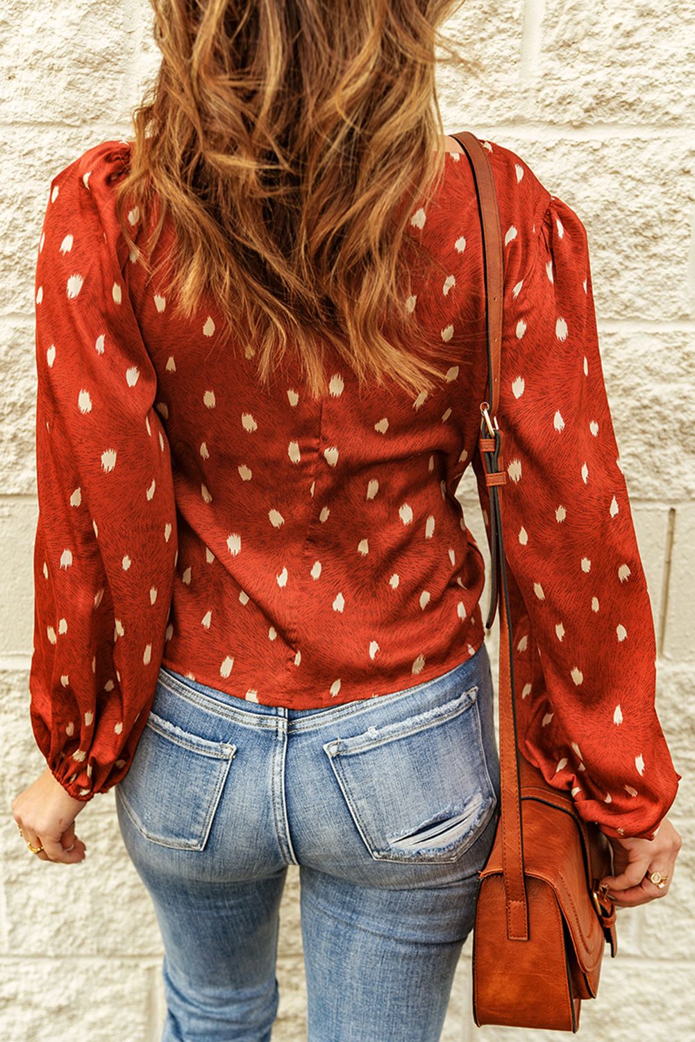 Orange Crisscross Dotted Print Bubble Sleeve Blouse