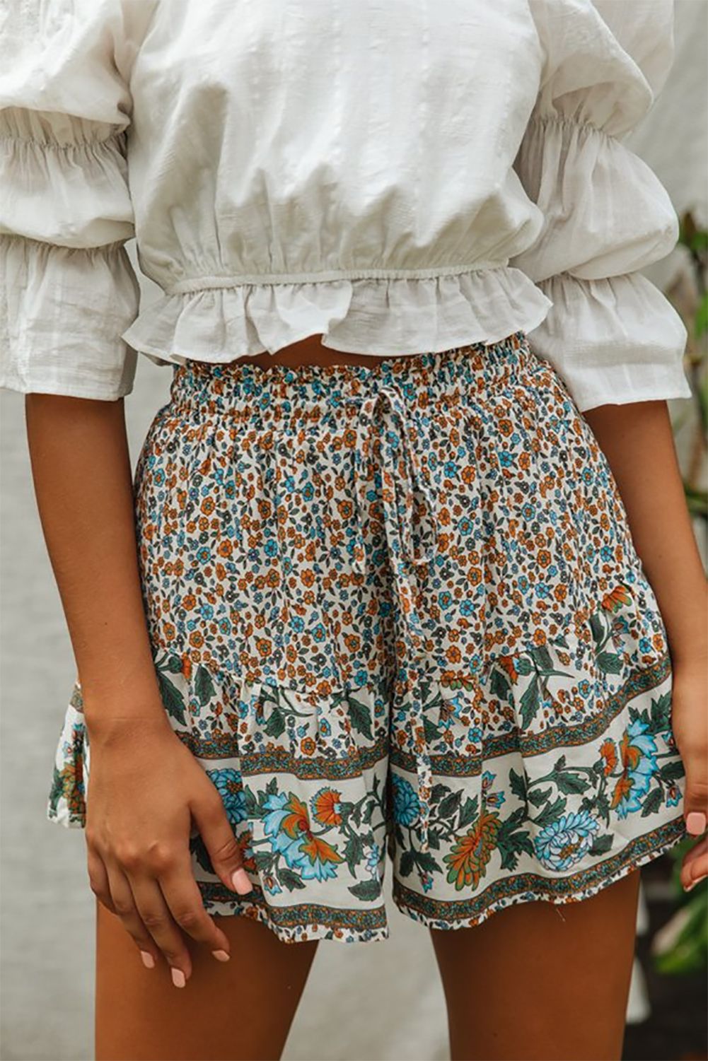 Blue Summer Boho Floral Print A-line Elastic Waist Shorts