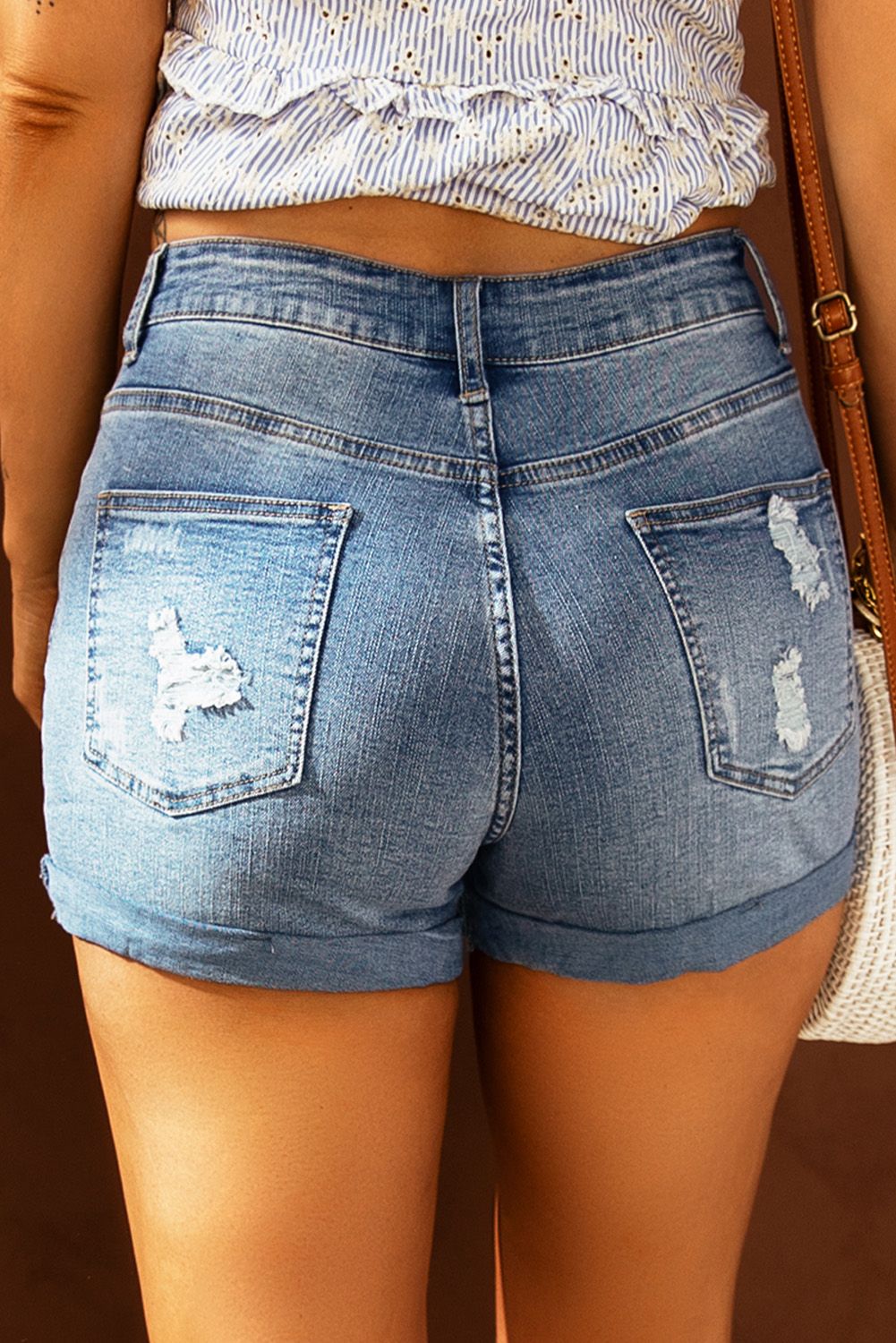 The rolled cuff creates a definite separation from the shorts to your legs Wear denim shorts to enhance you a pair of sexy long legs The distressed look and faded tone gives the illusion of jeans a retro chic flavor 5 pockets, zip fly bronze button closure Stay in touch with your edgy chic side with our womens denim shorts