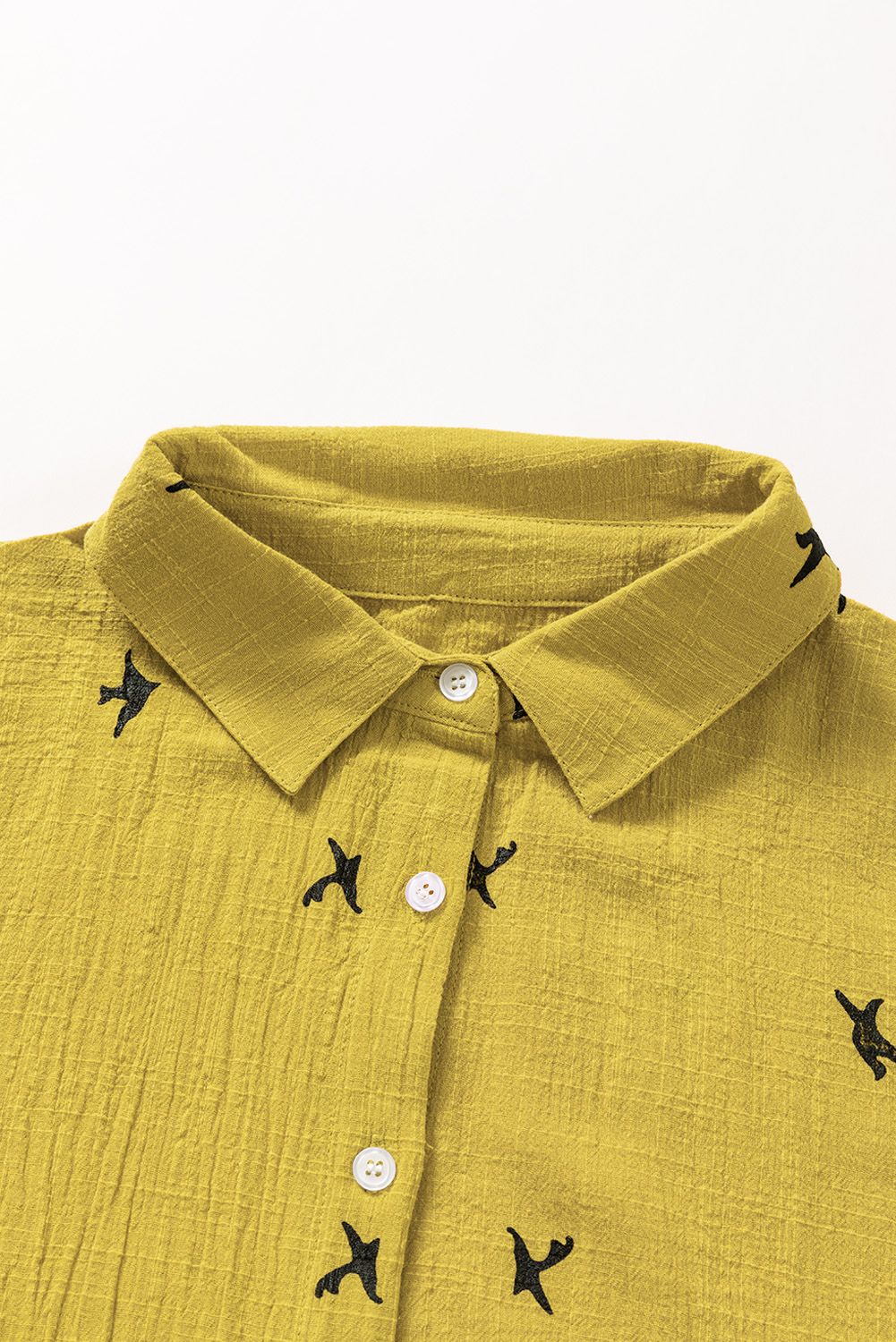 Solid color shirt with bird print throughout, button closure front